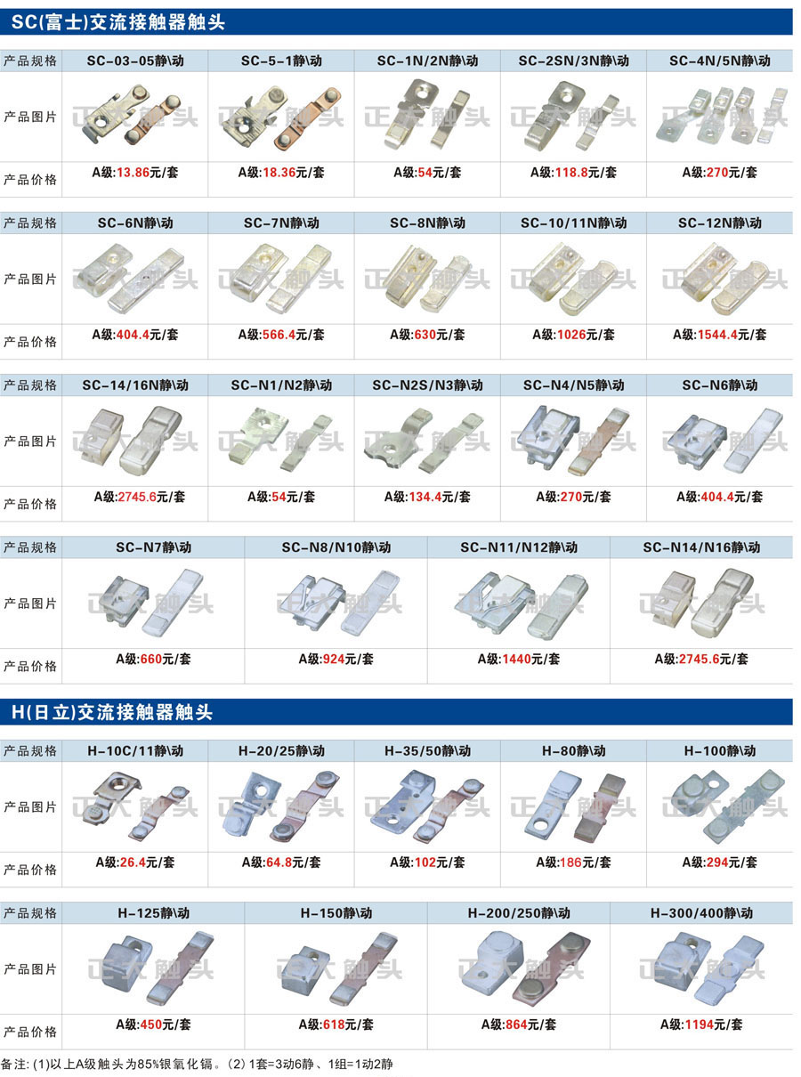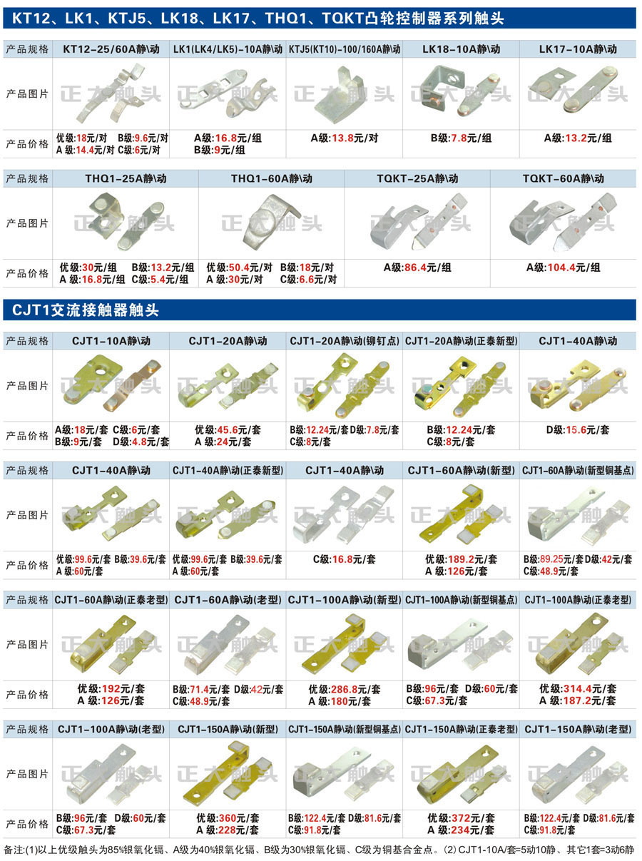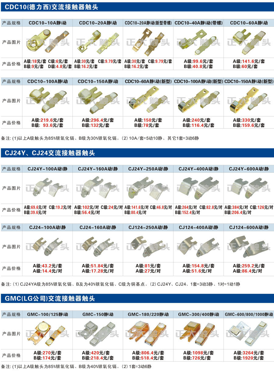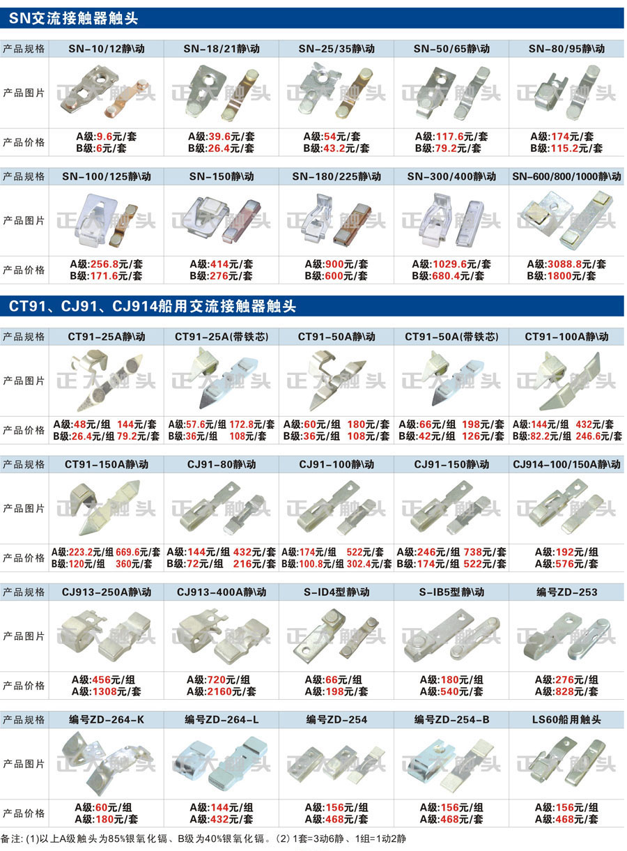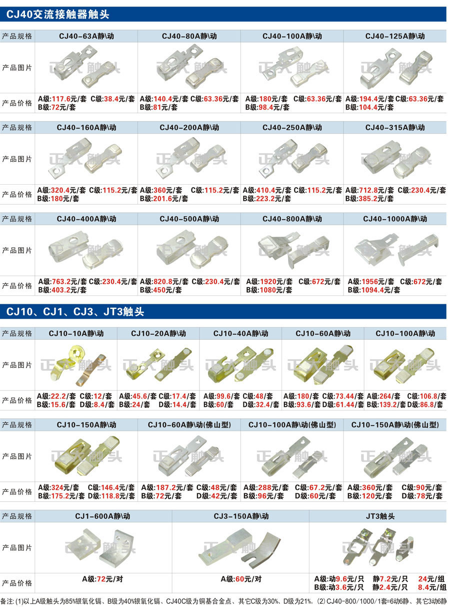 触头元件作为电器开关核心元件,主要用于接触器,继电器,断路器,凸轮控制器,补偿器,行程开关,脚踏开关,辅助开关等。suncitygroup太阳集团电气现生产CJT1,CJX1,CJX2,CJX4,CJX5,CJX8(B系列)CJ20,CJ40,CJ12,CJ15,CJ24,CJ24Y,CJ0,CDC10,CJ91,CT91,CJ913,CJ914,CJ3,CJ8Z交流接触器触头,CZ0,CZ1,CZ3,CZ17,CZ18,CG5直流接触器触头,QJ3,QC83补偿器触头,凸轮控制器,主令触头,KT10,KT12,KT14,KTJ1,KTJ5,KTJ6,KTJ15(QT5),LK1,LK17,LK18,THQ1,TQKT等;断路器触头DW10,DW16,DW15,DW17,DW45,DZ10,DZ20,内燃机触头,矿用触头,叉车,吊车触头,JYN1,JYN2,ZN28,SN10,VS1,梅花触头等。进口ABB系列AF,EH,EK,富士SC系列,日立H系列,施耐德LC1系列,西门子3TF,3TB系列,LG公司(LS产电)GMC系列,三菱机电SN系列。与国内正泰,德力西,天正,人民等,国外ABB,施耐德,西门子,富士,三菱等厂家电气配套。
