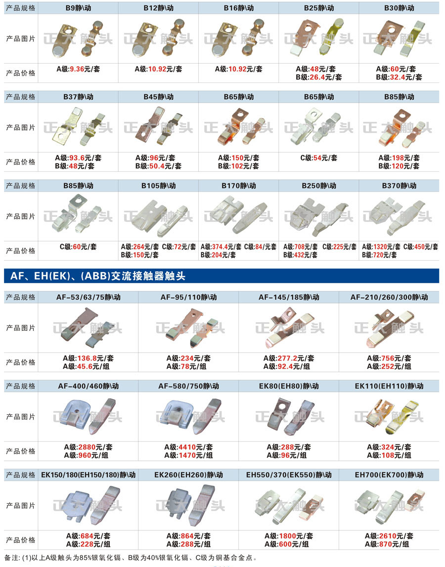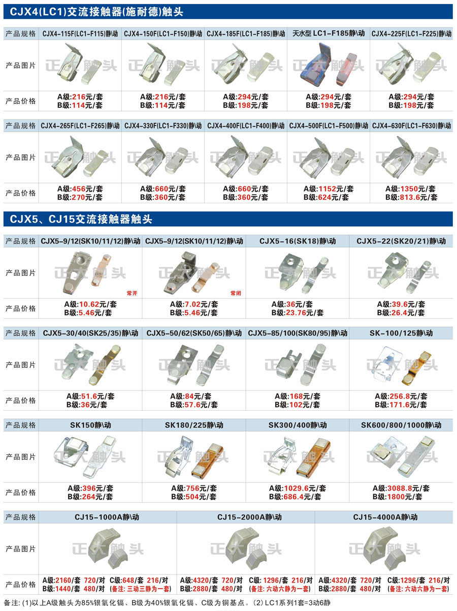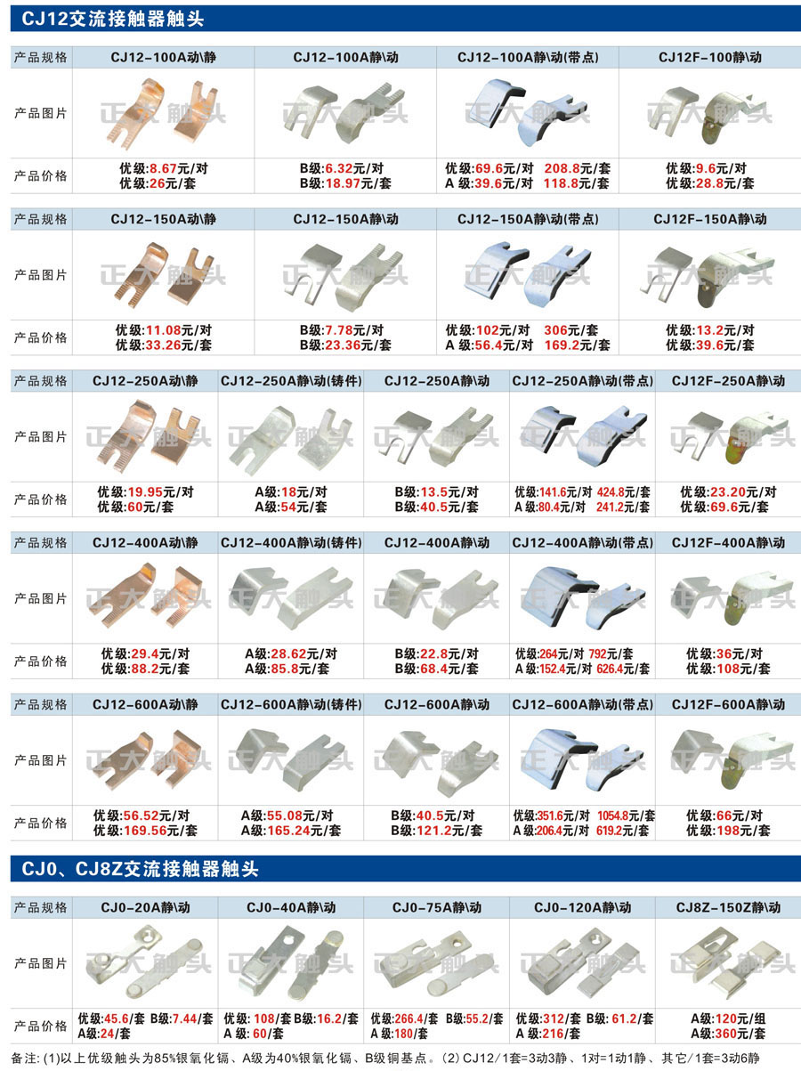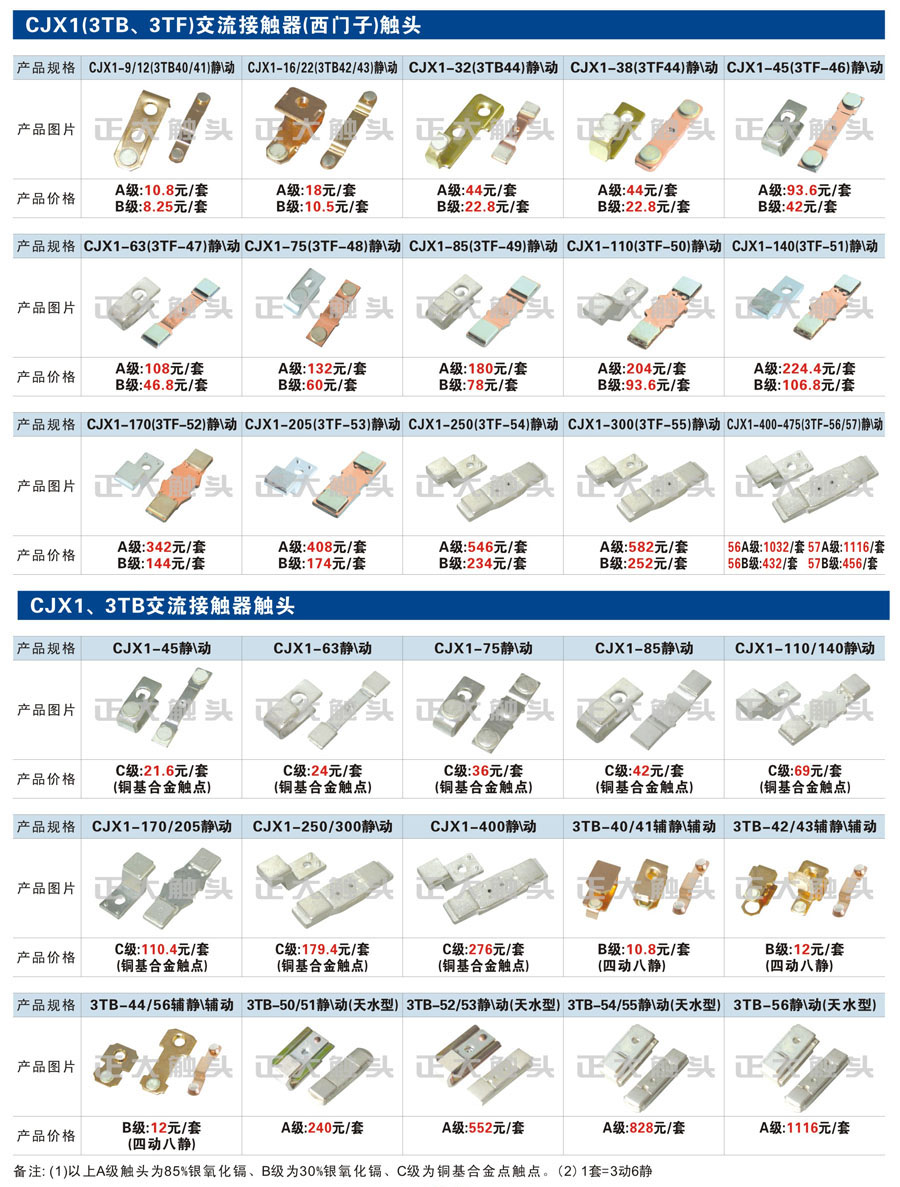 触头元件作为电器开关核心元件,主要用于接触器,继电器,断路器,凸轮控制器,补偿器,行程开关,脚踏开关,辅助开关等。suncitygroup太阳集团电气现生产CJT1,CJX1,CJX2,CJX4,CJX5,CJX8(B系列)CJ20,CJ40,CJ12,CJ15,CJ24,CJ24Y,CJ0,CDC10,CJ91,CT91,CJ913,CJ914,CJ3,CJ8Z交流接触器触头,CZ0,CZ1,CZ3,CZ17,CZ18,CG5直流接触器触头,QJ3,QC83补偿器触头,凸轮控制器,主令触头,KT10,KT12,KT14,KTJ1,KTJ5,KTJ6,KTJ15(QT5),LK1,LK17,LK18,THQ1,TQKT等;断路器触头DW10,DW16,DW15,DW17,DW45,DZ10,DZ20,内燃机触头,矿用触头,叉车,吊车触头,JYN1,JYN2,ZN28,SN10,VS1,梅花触头等。进口ABB系列AF,EH,EK,富士SC系列,日立H系列,施耐德LC1系列,西门子3TF,3TB系列,LG公司(LS产电)GMC系列,三菱机电SN系列。与国内正泰,德力西,天正,人民等,国外ABB,施耐德,西门子,富士,三菱等厂家电气配套。