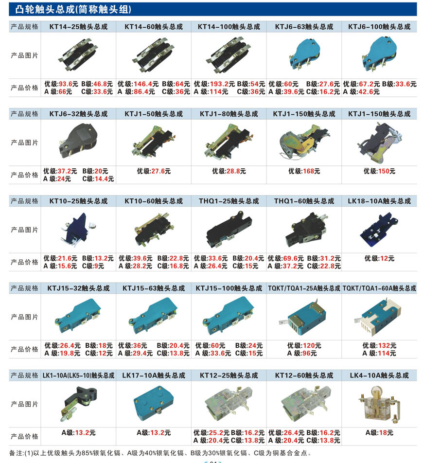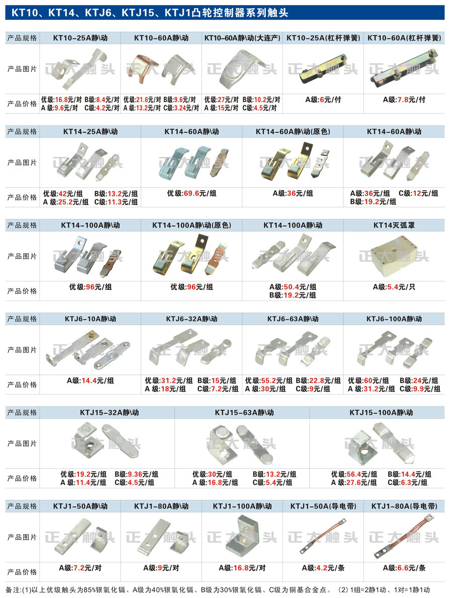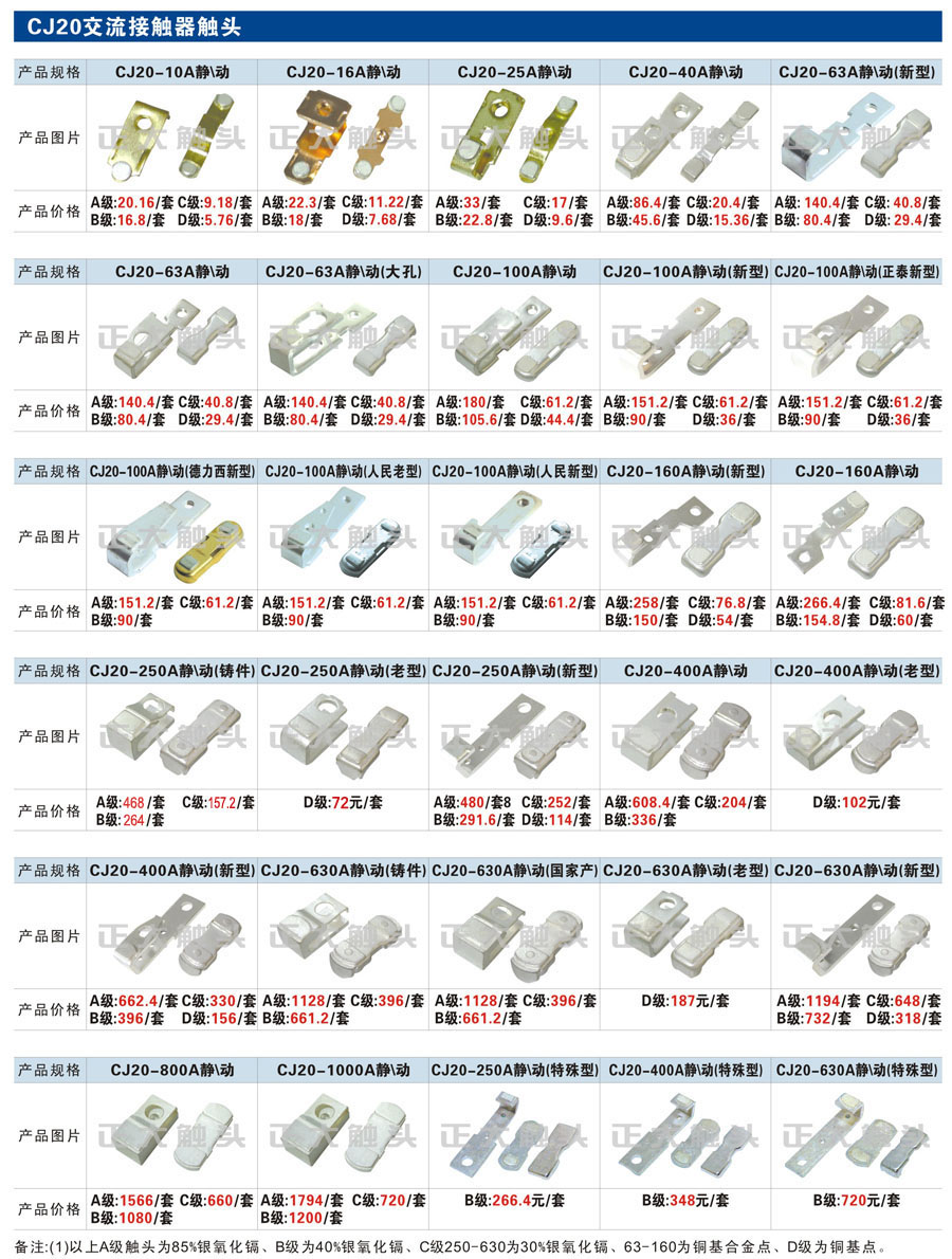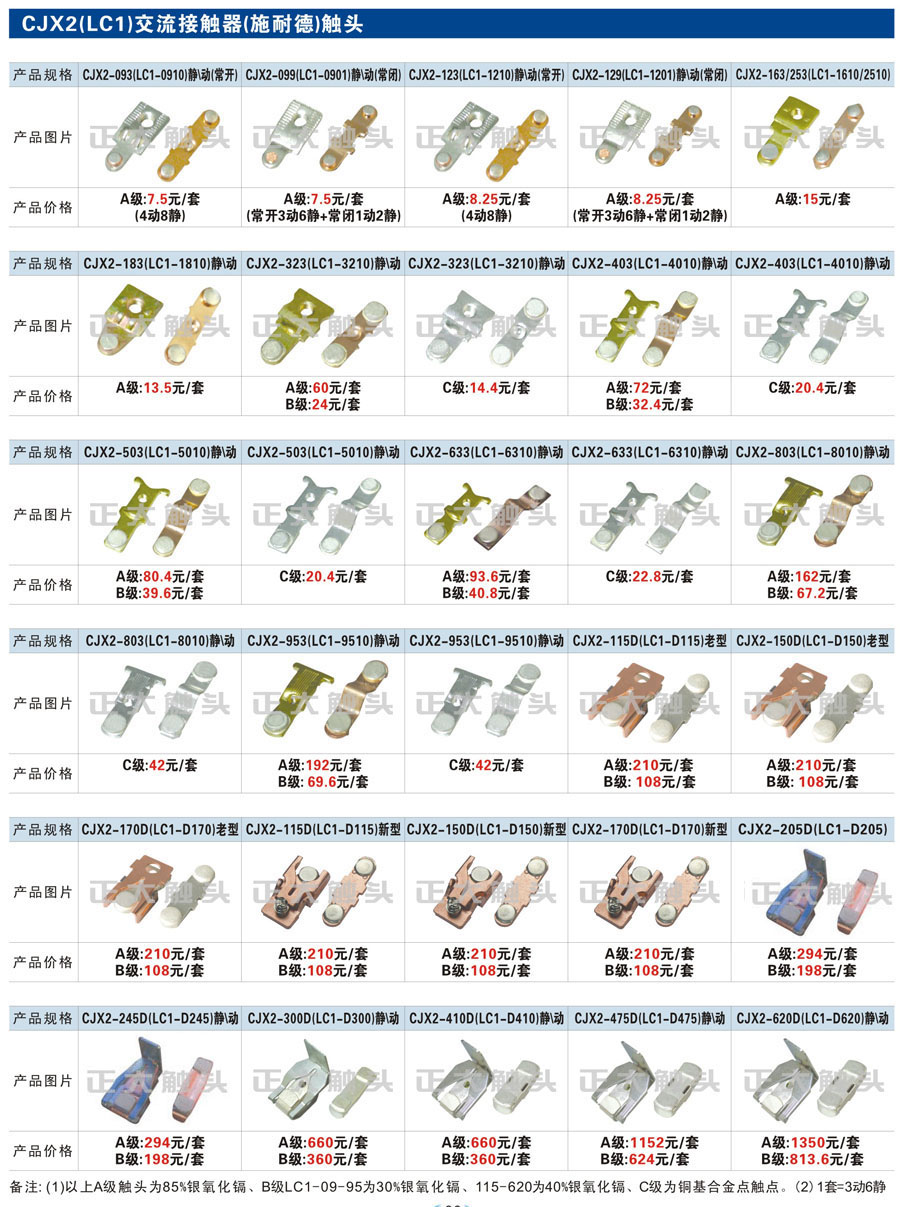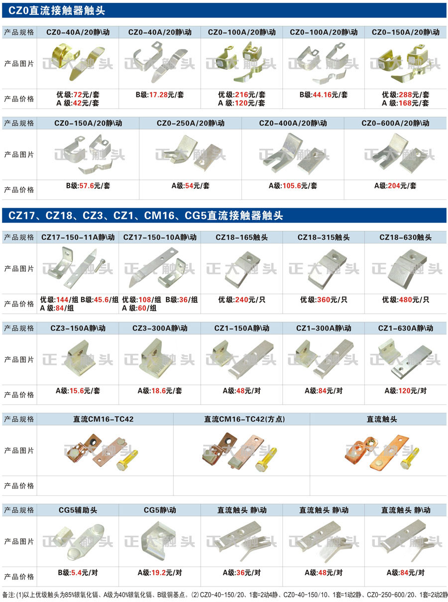 触头元件作为电器开关核心元件,主要用于接触器,继电器,断路器,凸轮控制器,补偿器,行程开关,脚踏开关,辅助开关等。suncitygroup太阳集团电气现生产CJT1,CJX1,CJX2,CJX4,CJX5,CJX8(B系列)CJ20,CJ40,CJ12,CJ15,CJ24,CJ24Y,CJ0,CDC10,CJ91,CT91,CJ913,CJ914,CJ3,CJ8Z交流接触器触头,CZ0,CZ1,CZ3,CZ17,CZ18,CG5直流接触器触头,QJ3,QC83补偿器触头,凸轮控制器,主令触头,KT10,KT12,KT14,KTJ1,KTJ5,KTJ6,KTJ15(QT5),LK1,LK17,LK18,THQ1,TQKT等;断路器触头DW10,DW16,DW15,DW17,DW45,DZ10,DZ20,内燃机触头,矿用触头,叉车,吊车触头,JYN1,JYN2,ZN28,SN10,VS1,梅花触头等。进口ABB系列AF,EH,EK,富士SC系列,日立H系列,施耐德LC1系列,西门子3TF,3TB系列,LG公司(LS产电)GMC系列,三菱机电SN系列。与国内正泰,德力西,天正,人民等,国外ABB,施耐德,西门子,富士,三菱等厂家电气配套。